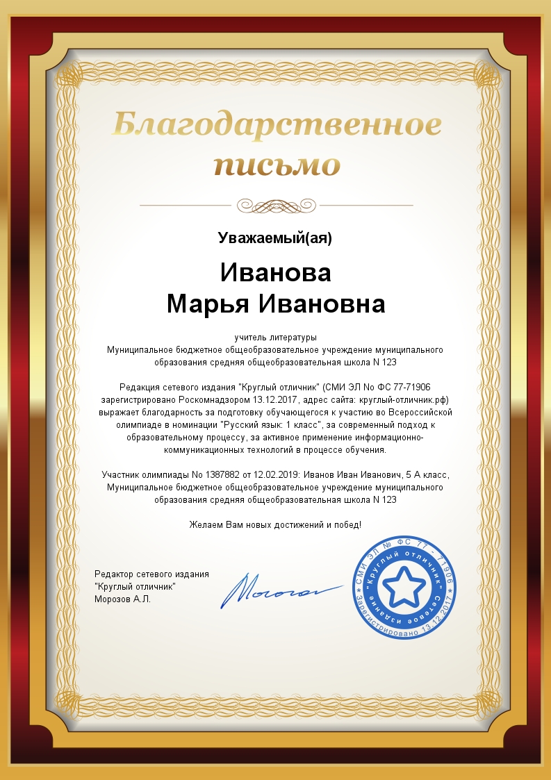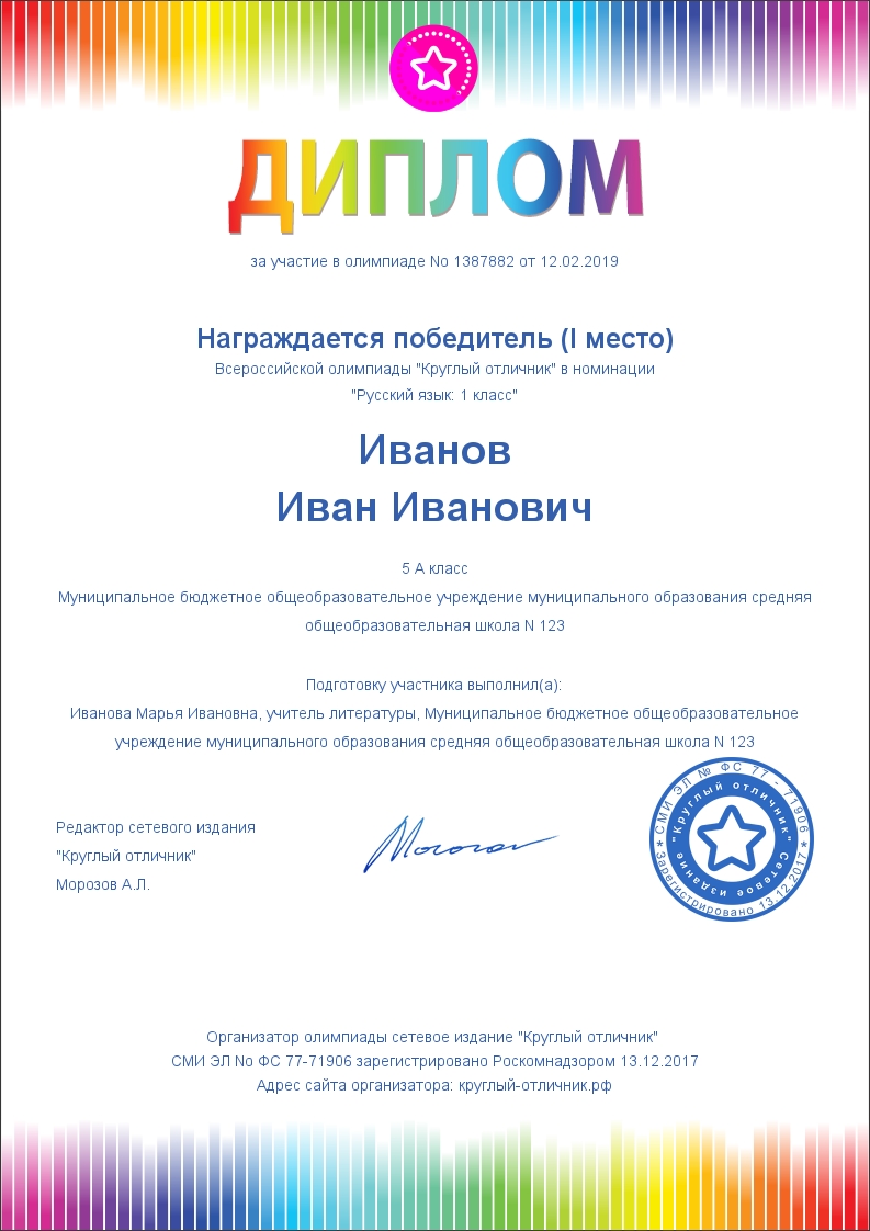 Проверяйте знания обучающихся без каких-либо ограничений. Прохождение теста и сохранение итогов в реестре любое количество раз — полностью бесплатно! Мы берём плату 100 рублей только за изготовление диплома, подтверждающего факт участия в олимпиаде. Вместе с дипломом выдаётся благодарственное письмо для куратора (педагога, выполнившего подготовку обучающегося).